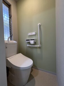 トイレ・洗面・脱衣室それぞれで照明計画を分け、用途に応じた明るさをご提案しました。トイレは電球色で落ち着きのある空間に、脱衣室は明るく使いやすい空間に仕上げています。壁紙のアクセントや全体の雰囲気は、事前に3Dパース図でご提案し、イメージ通りの明るく清潔感のある仕上がりとなりました。